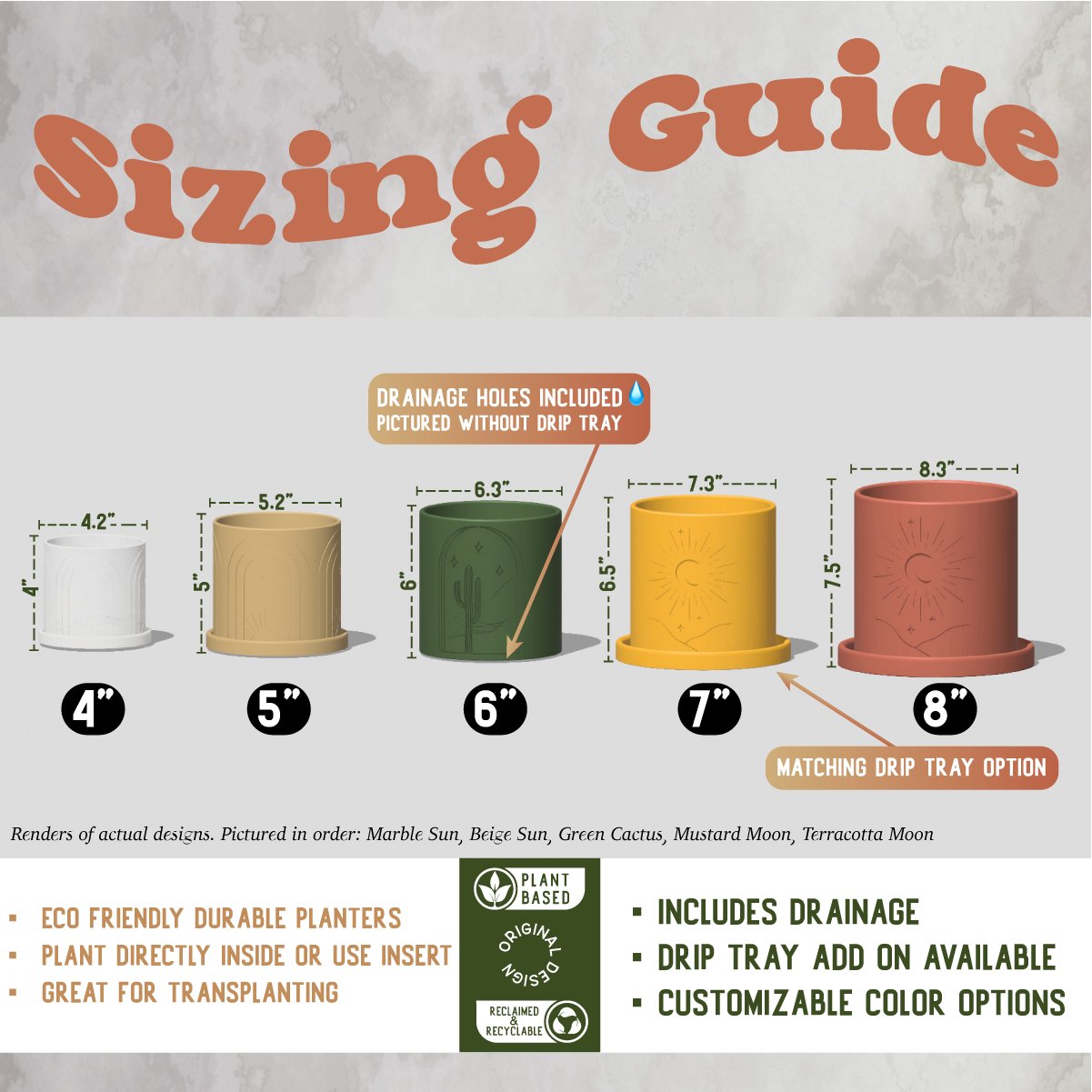 Our planters are 3D printed with PLA - a type of thermoplastic polymer derived from Upcycled materials like Corn, Beets, and Wheat Grass. PLA is 100% biodegradable, recyclable and compostable!